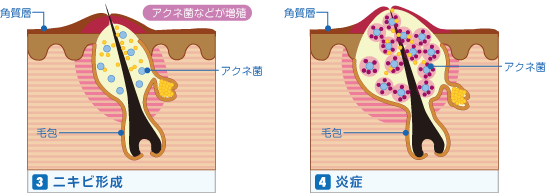 | 皮脂が溜まってアクネ菌が増殖します。 | 皮脂を栄養分にアクネ菌が異常増殖して皮膚が炎症をおこします。(=赤いポツポツ) |
